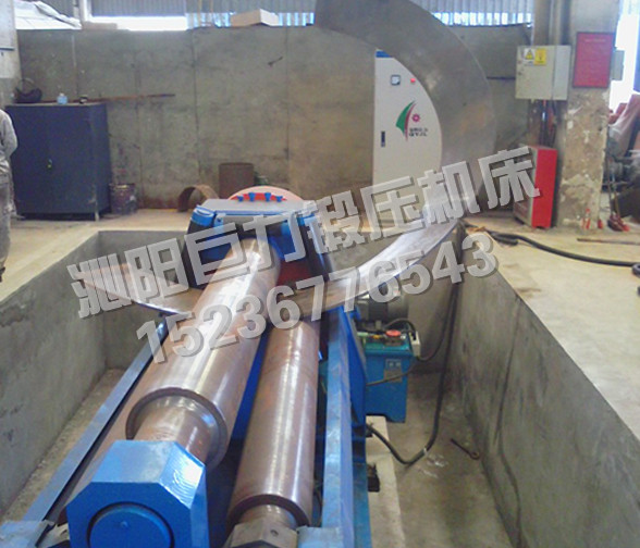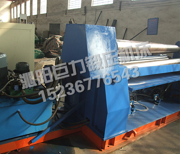 該機(jī)型的上輥固定,兩下輥呈傾斜狀做旋轉(zhuǎn)運(yùn)動,兩下輥可以同時升降,也可以單升單降,用以完成板材的端部預(yù)彎。