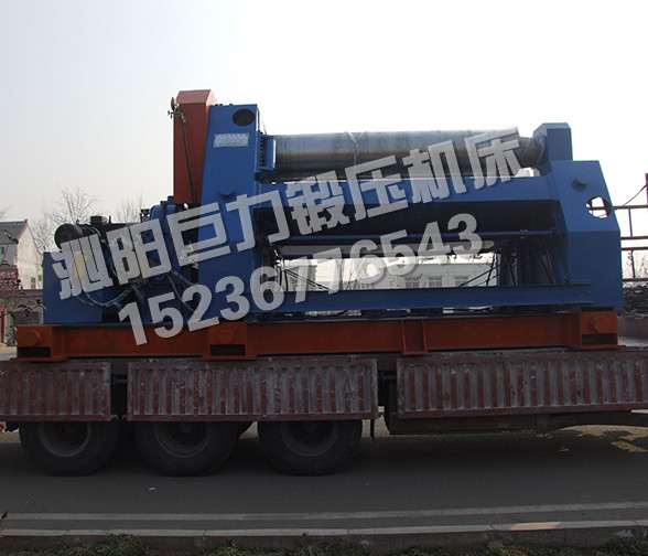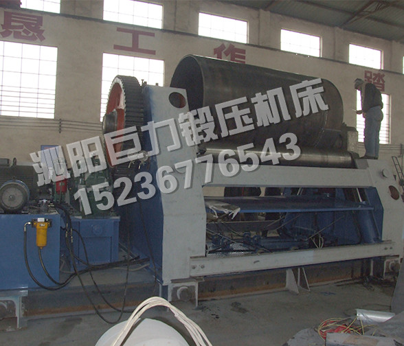 該四輥卷板機與對稱三輥卷板機比較,它可以不借助其它設備模具,直接予彎板材端部,而且剩余直邊較小;它可以不使板材調頭,而卷成工件。